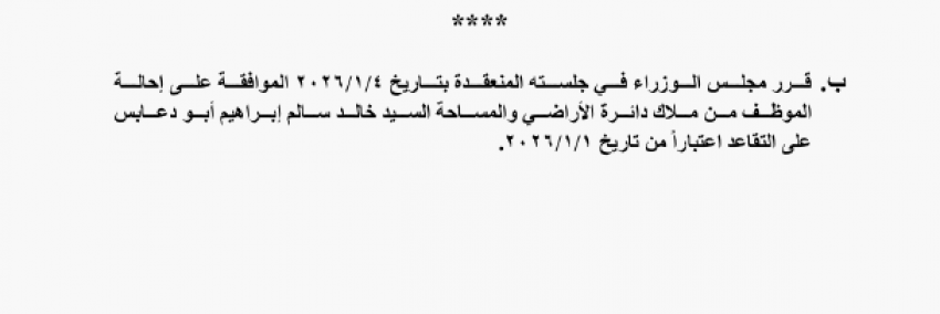القلعة نيوز- صدرت في عدد الجريدة الرسمية اليوم الخميس ، قرارات مجلس الوزراء، باحالة الموظف من ملاك دائرة الاراضي والمساحة ،خالد سالم أبو دعابس إلى التقاعد وذلك اعتبارًا من تاريخ 4 - 1 - 2026.