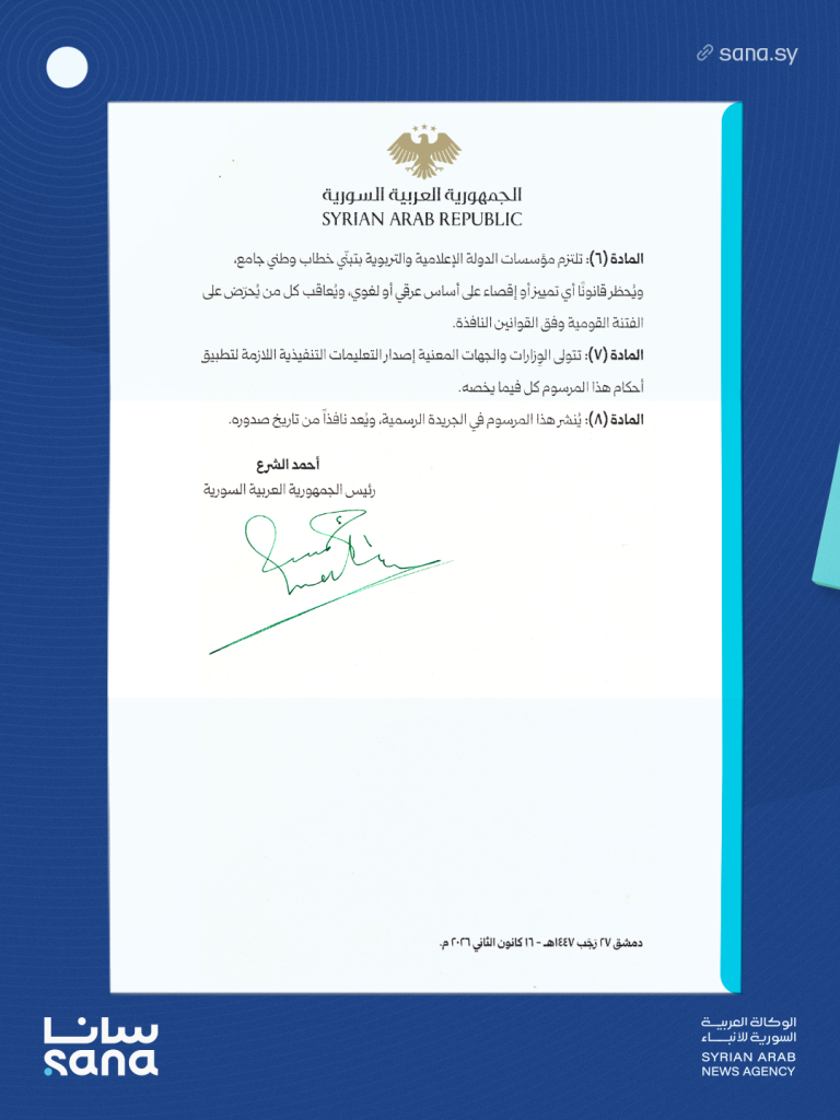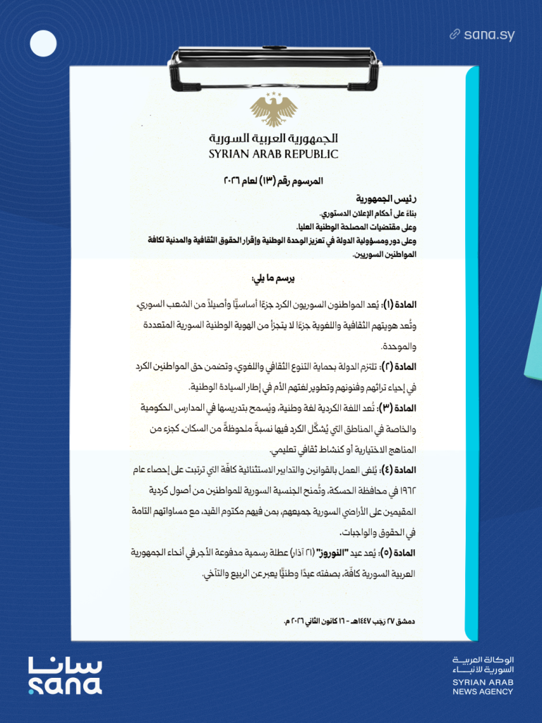 القلعة نيوز- أصدر الرئيس السوري أحمد الشرع المرسوم رقم (13) لعام 2026 الذي يؤكد أن المواطنين السوريين الكرد جزء أساسي وأصيل من الشعب السوري، وأن هويتهم الثقافية واللغوية جزء لا يتجزأ من الهوية الوطنية السورية المتعددة والموحدة.