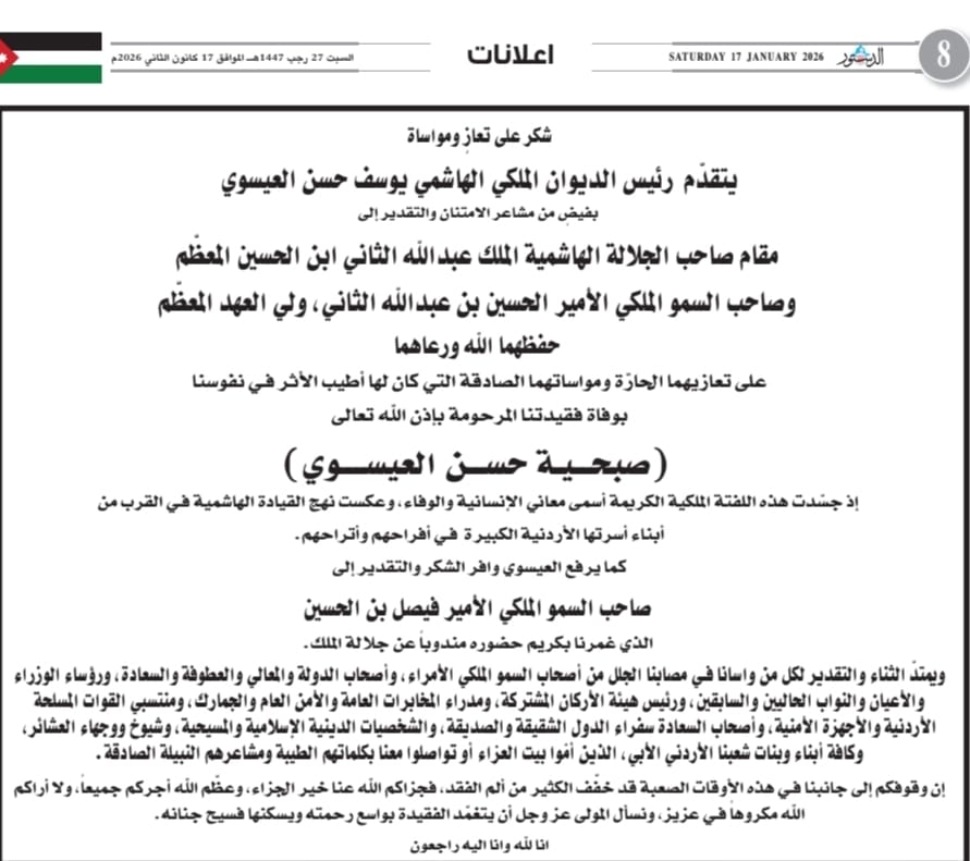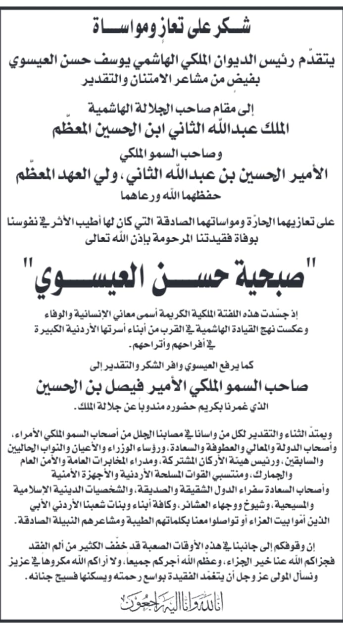 شكر على تعازٍ بوفاة شقيقة رئيس الديوان الملكي العيسوي