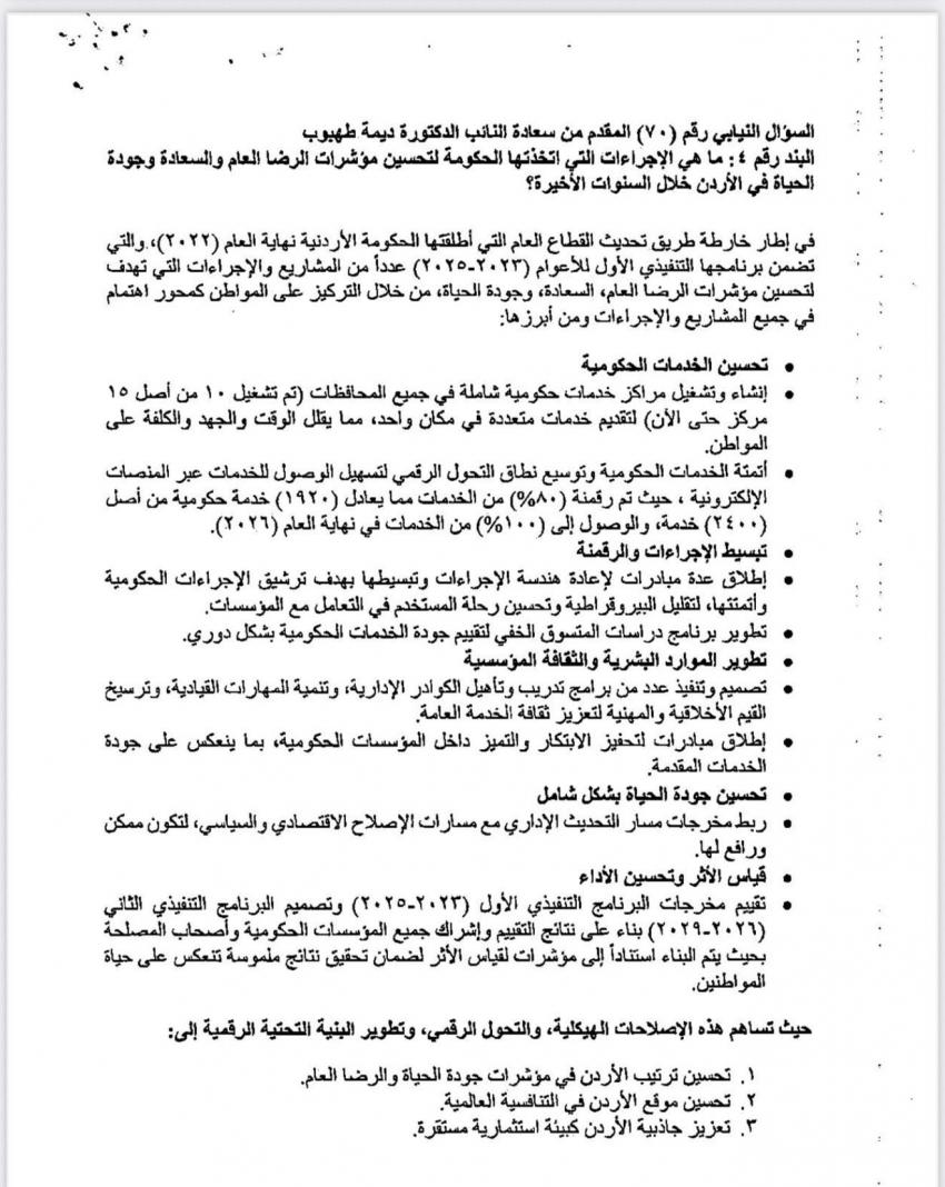 وبينت أنها تلقت جوابا على السؤال الرابع بخصوص خطط الحكومة لتحسين مؤشرات الرضى والسعادة، وقد سرد الجواب المقدم من وزارة تطوير القطاع العام ما تنوي أن تقوم به الوزارة تنظيميًا وإداريًا، لكنه من زاوية رقابية وبرلمانية لا يزال أقرب إلى عرض برامج منه إلى إجابة على سؤال مؤشرات.