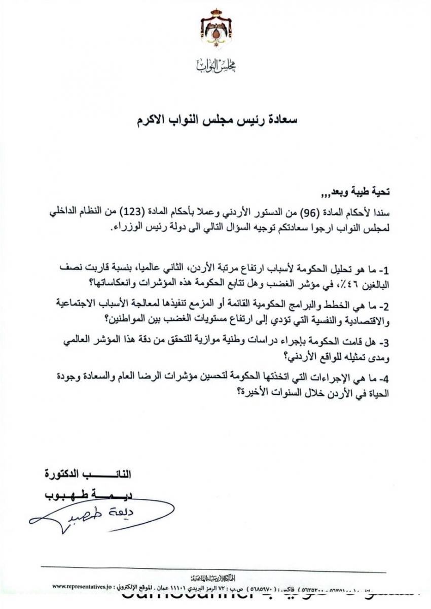 ١. ما هو تحليل الحكومة لأسباب ارتفاع مرتبة الأردن، الثاني عالميا، بنسبة قاربت نصف البالغين ٤٦٪، في مؤشر الغضب وهل تتابع الحكومة هذه المؤشرات وانعكاساتها؟