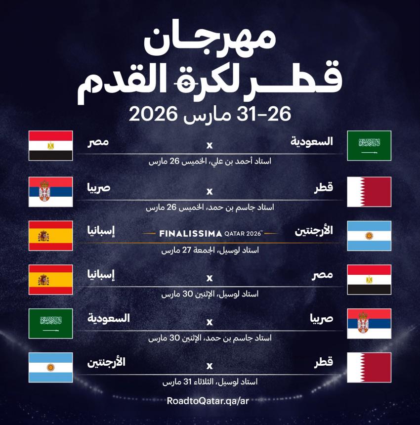 القلعة نيوز- أعلنت اللجنة المحلية المنظمة لأحداث كرة القدم عن مهرجان قطر لكرة القدم 2026 الذي سيعقد خلال الفترة من 26 إلى 31 مارس.