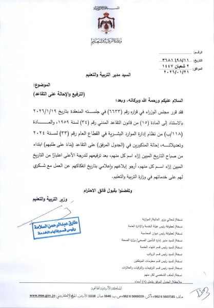 قرر مجلس الوزراء الموافقة على إحالة الموظفين المذكورين تالياً بعد ترفيعهم للدرجة الأعلى إلى التقاعد بناء على طلبهم.