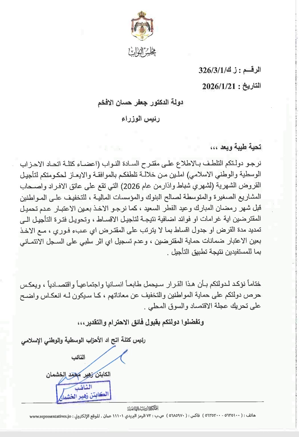 القلعة نيوز- وجّه رئيس كتلة اتحاد الأحزاب الوسطية والوطني الإسلامي النيابية، النائب زهير الخشمان، مذكرة نيابية إلى دولة رئيس الوزراء الدكتور جعفر حسان، طالب فيها الحكومة بتأجيل الأقساط الشهرية المترتبة على الأفراد وأصحاب المشاريع الصغيرة والمتوسطة لصالح البنوك والمؤسسات المالية، خلال شهري شباط وآذار من عام 2026.