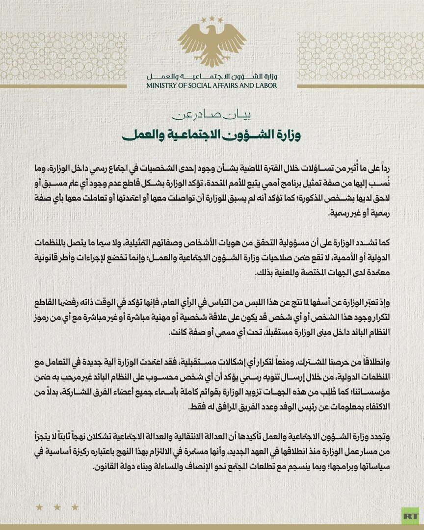 وشددت الوزارة على أن مسؤولية التحقق من هويات الأشخاص وصفاتهم التمثيلية ولا سيما ما يتصل بالمنظمات الدولية أو الأممية، لا تقع ضمن صلاحيات وزارة الشؤون الاجتماعية والعمل وإنما تخضع لإجراءات وأطر قانونية معتمدة لدى الجهات المختصة والمعنية بذلك.