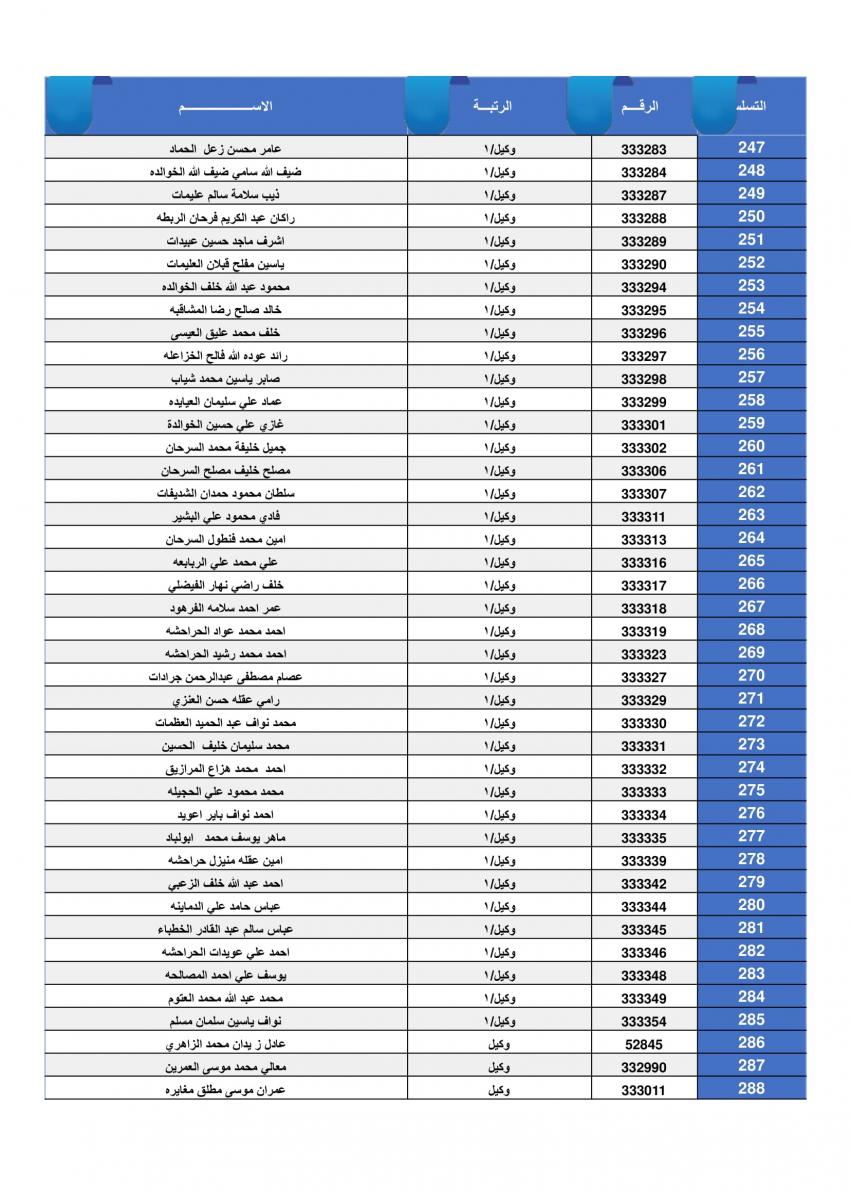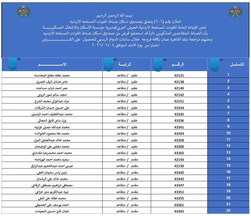 القلعة نيوز - أعلنت القيادة العامة للقوات المسلحة الأردنية – الجيش العربي/ مديرية مؤسسة الإسكان والأشغال العسكرية بان الضباط وضباط الصف والأفراد المبينة أسماءهم أدناه قد استحقوا قرض الإسكان العسكري (الخاص بالأفراد) والضباط المستفيدين من صندوق إسكان الضباط.