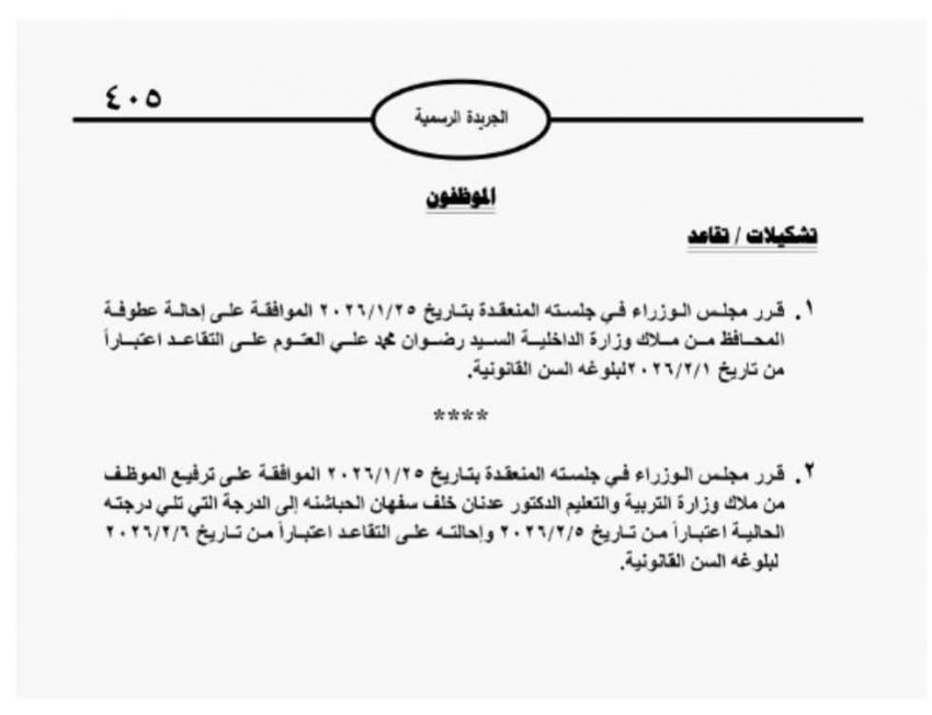 كما صدر قرار مجلس الوزراء القاضي بترفيع الموظف من ملاك وزارة التربية والتعليم الدكتور عدنان الحباشنة واحالته إلى التقاعد.