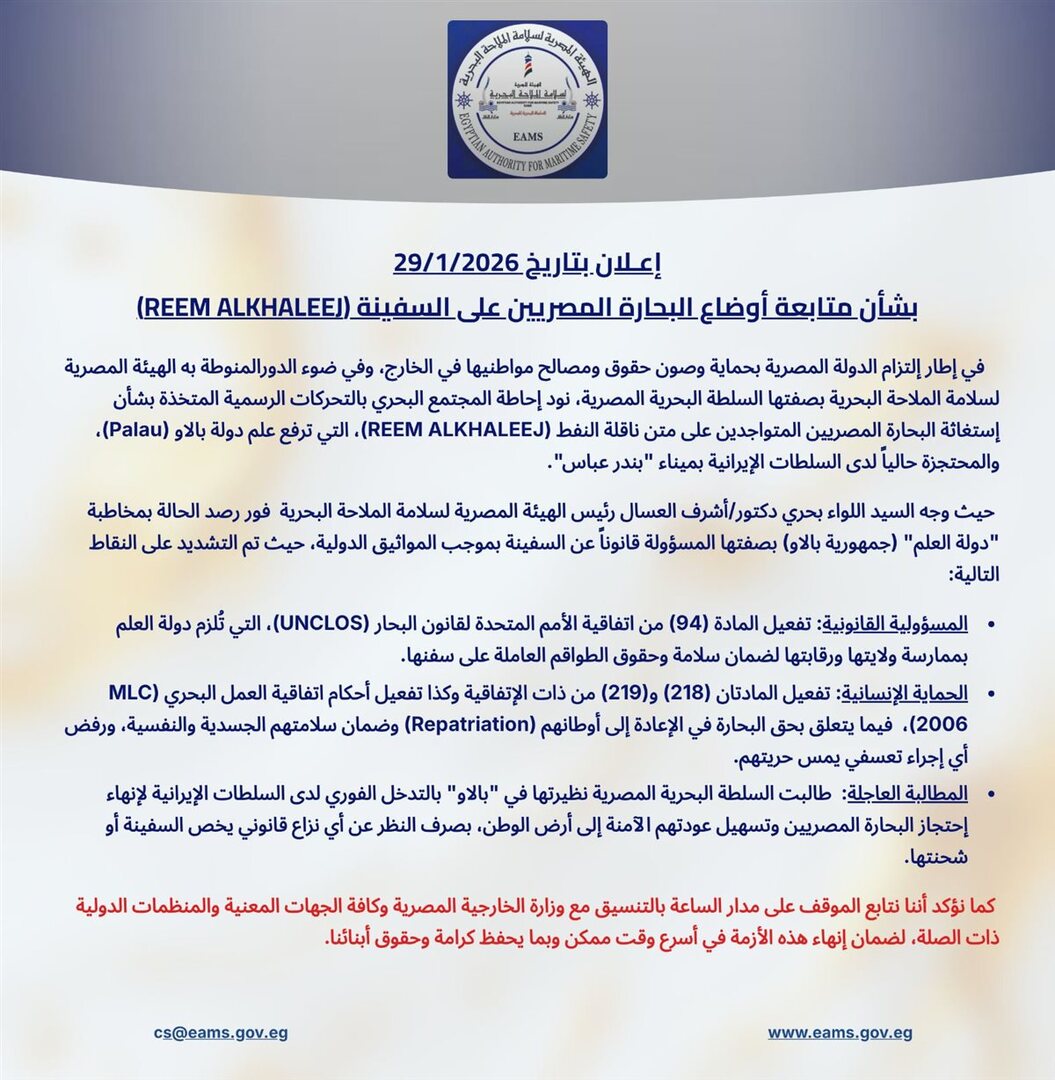 كما طالبت الهيئة المصرية نظيرتها في جمهورية بالاو بالتدخل الفوري والحاسم لدى الجانب الإيراني لإنهاء احتجاز البحارة وتسهيل ترحيلهم، مع التأكيد على ضرورة الفصل الكامل بين وضع الطاقم البشري وأي نزاعات قانونية أو فنية قد تتعلق بالسفينة أو شحنتها، تجسيدًا لمبدأ حماية حقوق الإنسان في العمل البحري.