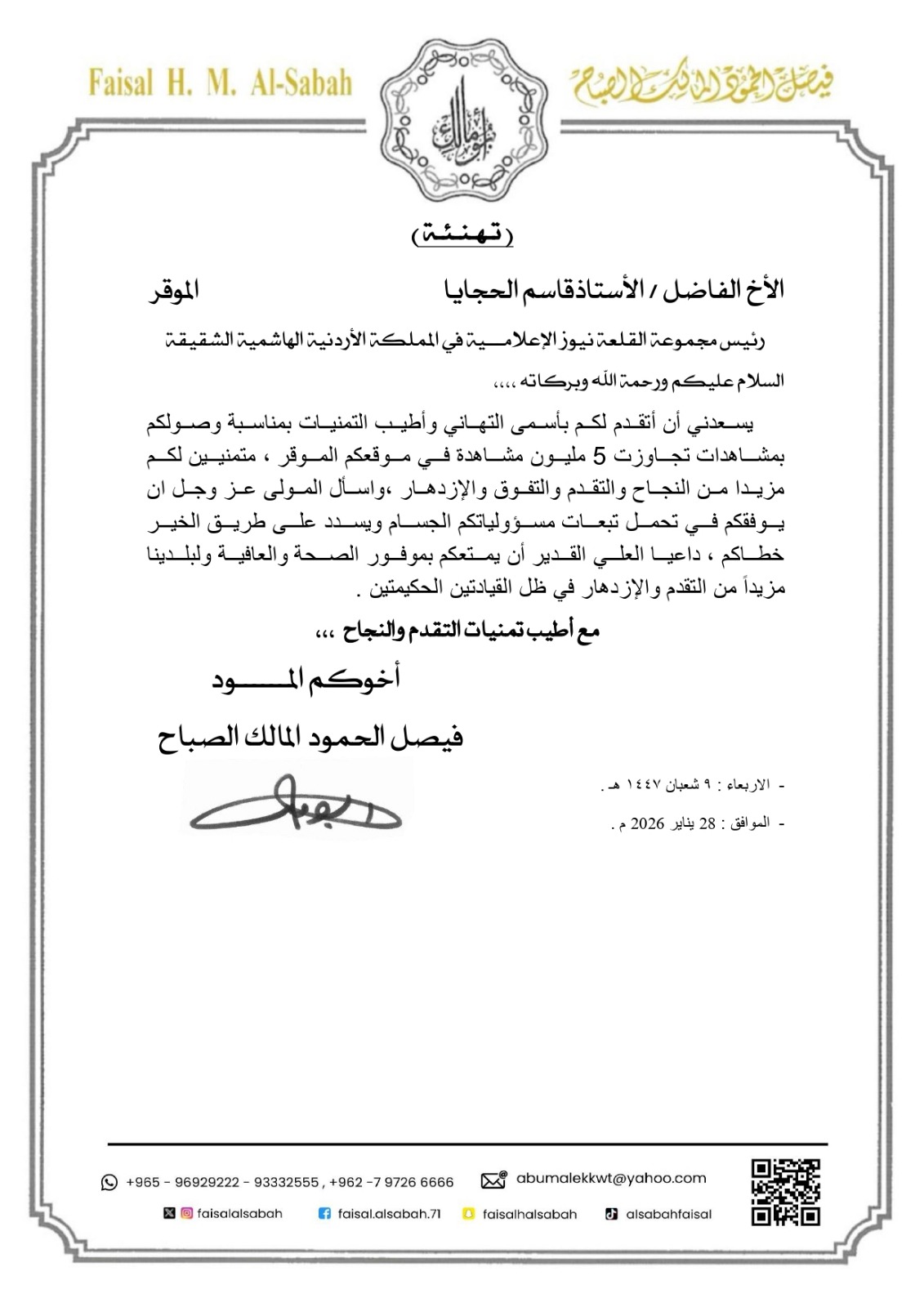 من الكويت إلى عمّان رسالة تهنئة لـ "القلعة نيوز" أبرقها الشيخ فيصل الحمود الصباح