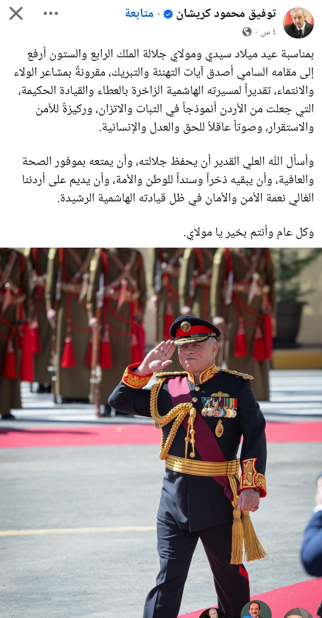 وأسأل الله العلي القدير أن يحفظ جلالته، وأن يمتعه بموفور الصحة والعافية، وأن يبقيه ذخراً وسنداً للوطن والأمة، وأن يديم على أردننا الغالي نعمة الأمن والأمان في ظل قيادته الهاشمية الرشيدة.