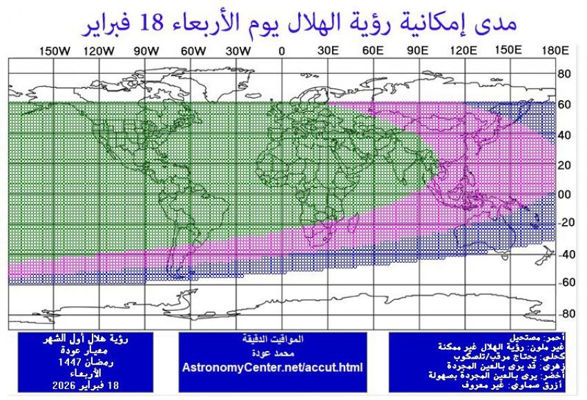 القلعة نيوز - قال مدير مركز الفلك الدولي المهندس محمد شوكت عودة، إن معظم الدول ستتحرى هلال شهر رمضان يوم الثلاثاء 17 شباط 2026م، لكن استنادا إلى جميع معايير رؤية الهلال المنشورة في أبحاث علمية محكمة (ومنها معيار العالم المسلم ابن طارق، والباحث فوثرينغهام، والباحث ماوندير، والباحث بروين، والباحث محمد إلياس، والمرصد الفلكي SAAO، والباحث يالوب، والباحث عودة)، فإن رؤية الهلال يوم الثلاثاء هي ما بين مستحيلة أو غير ممكنة من جميع مناطق العالم العربي والإسلامي سواء بالعين المجردة أو باستخدام التلسكوب أو حتى باستخدام تقنية التصوير الفلكي فائقة القوة.