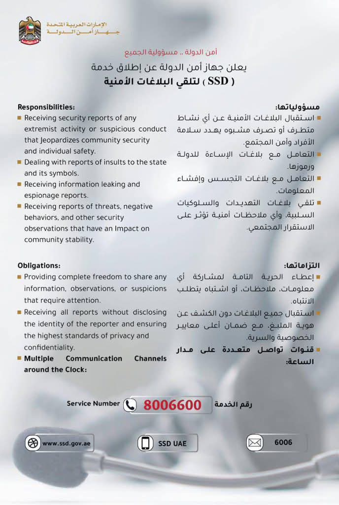 القلعة نيوز- أعلن جهاز أمن الدولة في دولة الإمارات العربية المتحدة عن إطلاق خدمة (SSD) لتلقي البلاغات الأمنية، في إطار تعزيز الأمن المجتمعي وحماية الاستقرار العام.