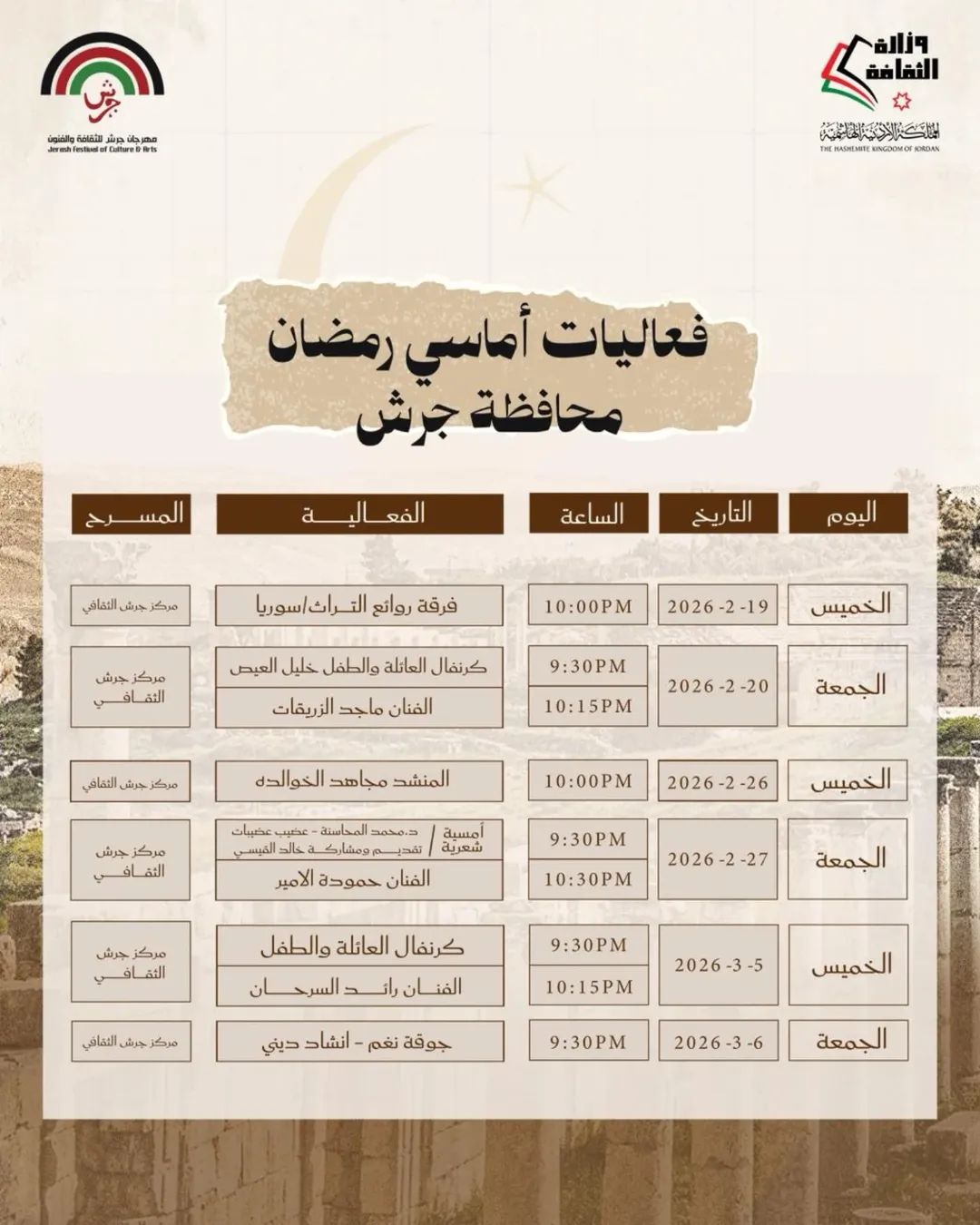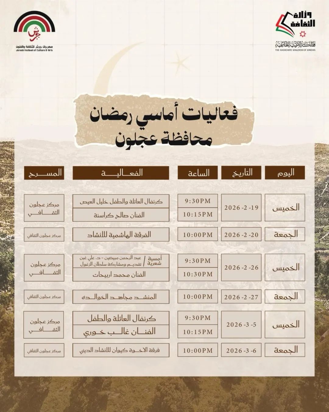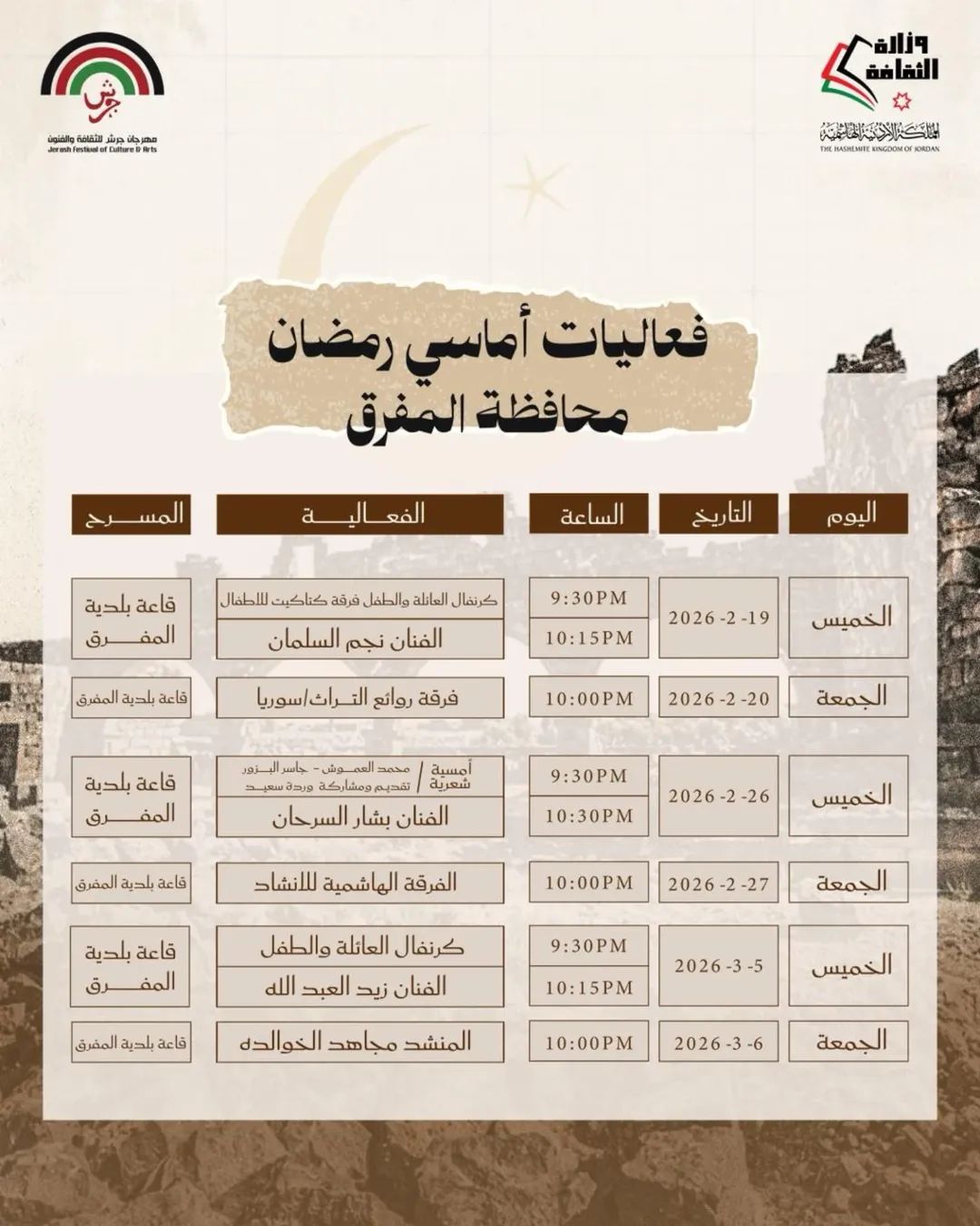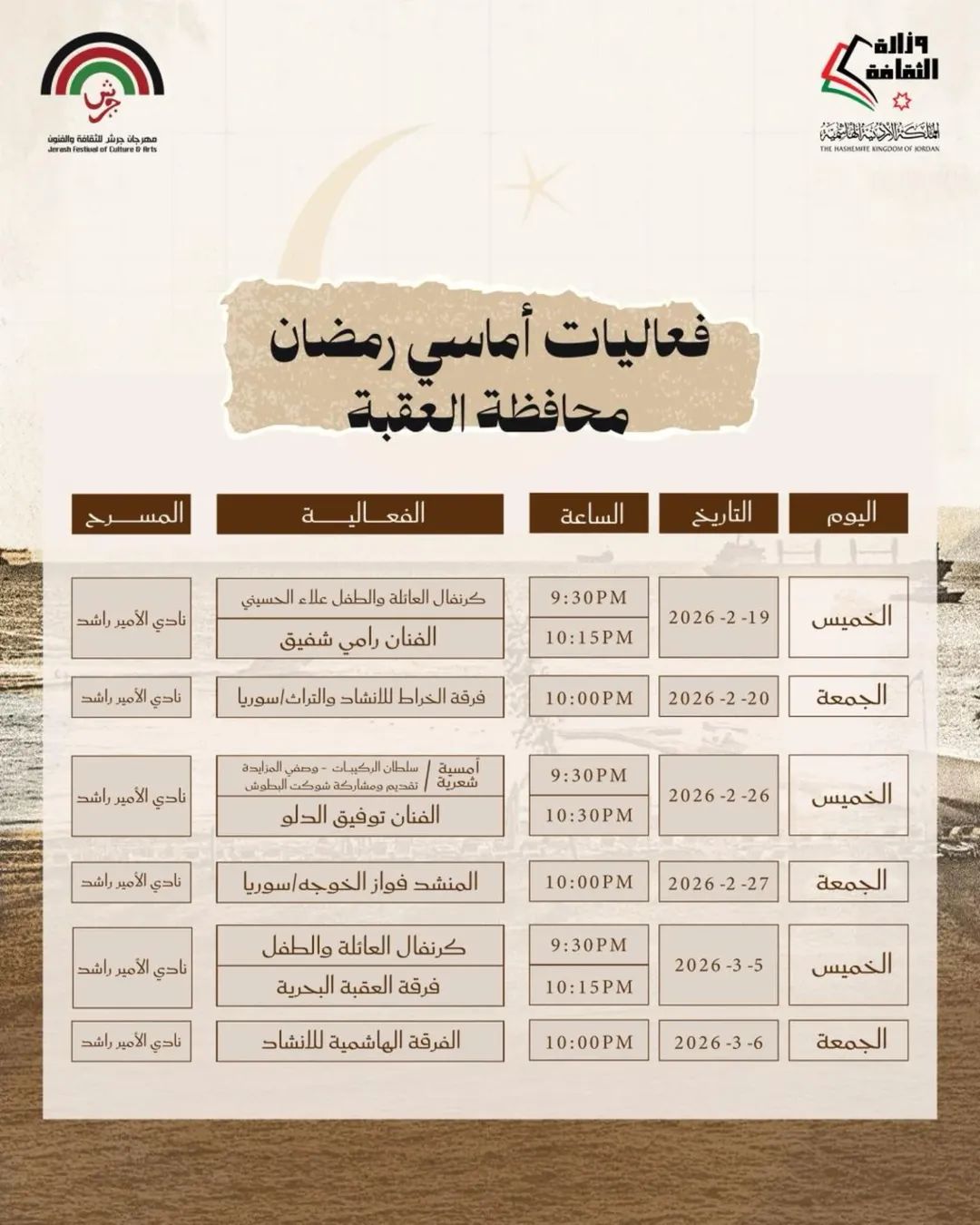 وأضاف أن البرنامج سيشمل مشاركة فرق الإنشاد الديني والمنشدين الأردنيين والعرب، إلى جانب العديد من الفقرات الترفيهية المناسبة للأطفال والعائلات الأردنية.