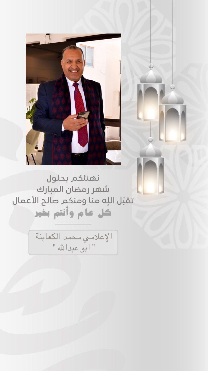 القلعة نيوز - بمناسبة حلول شهر رمضان المبارك يتقدم الزميل الإعلامي محمد الكعابنة بأسمى آيات التهنئة والتبريكات بهذه المناسبة المباركة إلى جلالة الملك عبدالله الثاني ابن الحسين المعظم وجلالة الملكة رانيا وولي عهده صاحب السمو الملكي الأمير الحسين بن عبدالله الثاني وإلى الأسرة الهاشمية وإلى الشعب الأردني، والأمتين العربية والإسلامية.