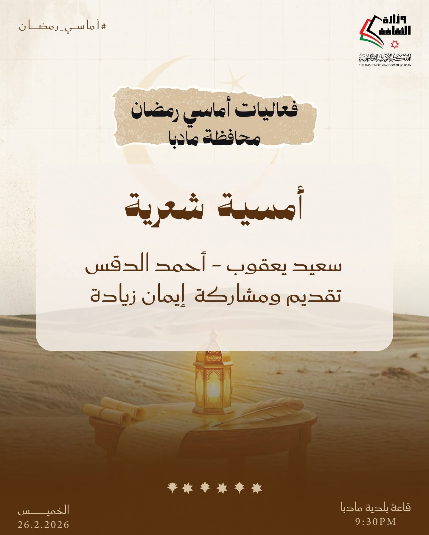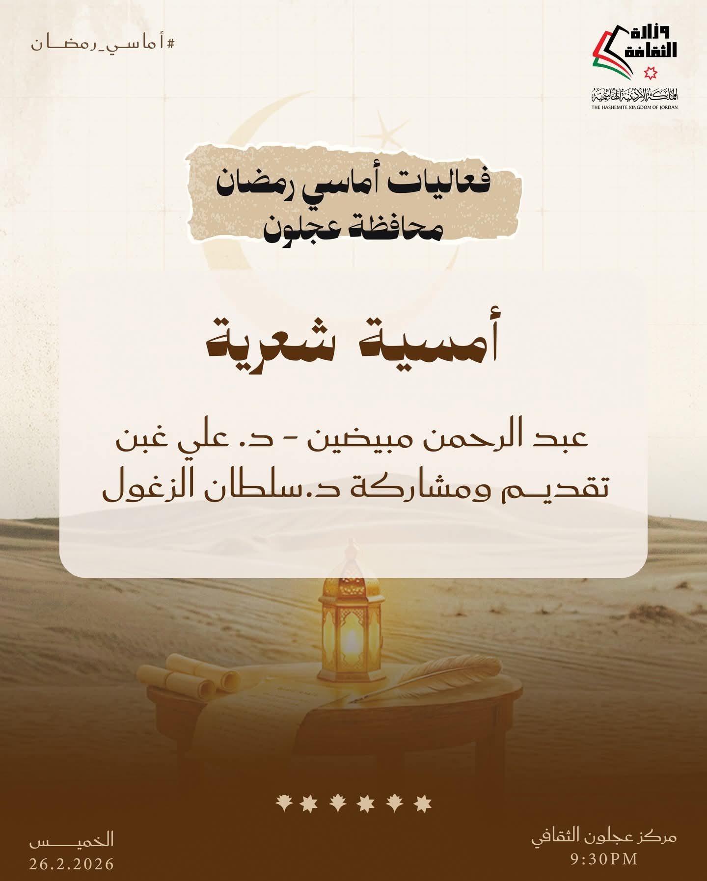 ففي محافظة العاصمة، يحتضن المركز الثقافي الملكي عند الساعة التاسعة والنصف مساءً أمسية شعرية بمشاركة الدكتورة إيمان عبد الهادي وتيسير الشماسين، ويقدمها ويشارك فيها الدكتور علي الشوابكة.