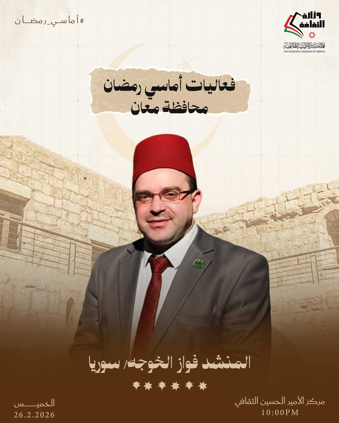 وفي محافظة الكرك، يستضيف مركز الأمير الحسن الثقافي عند الساعة العاشرة مساءً حفلًا إنشاديًا تحييه فرقة «أنوار الشام» من سوريا، مقدمةً باقة من الأناشيد الدينية والتراثية.