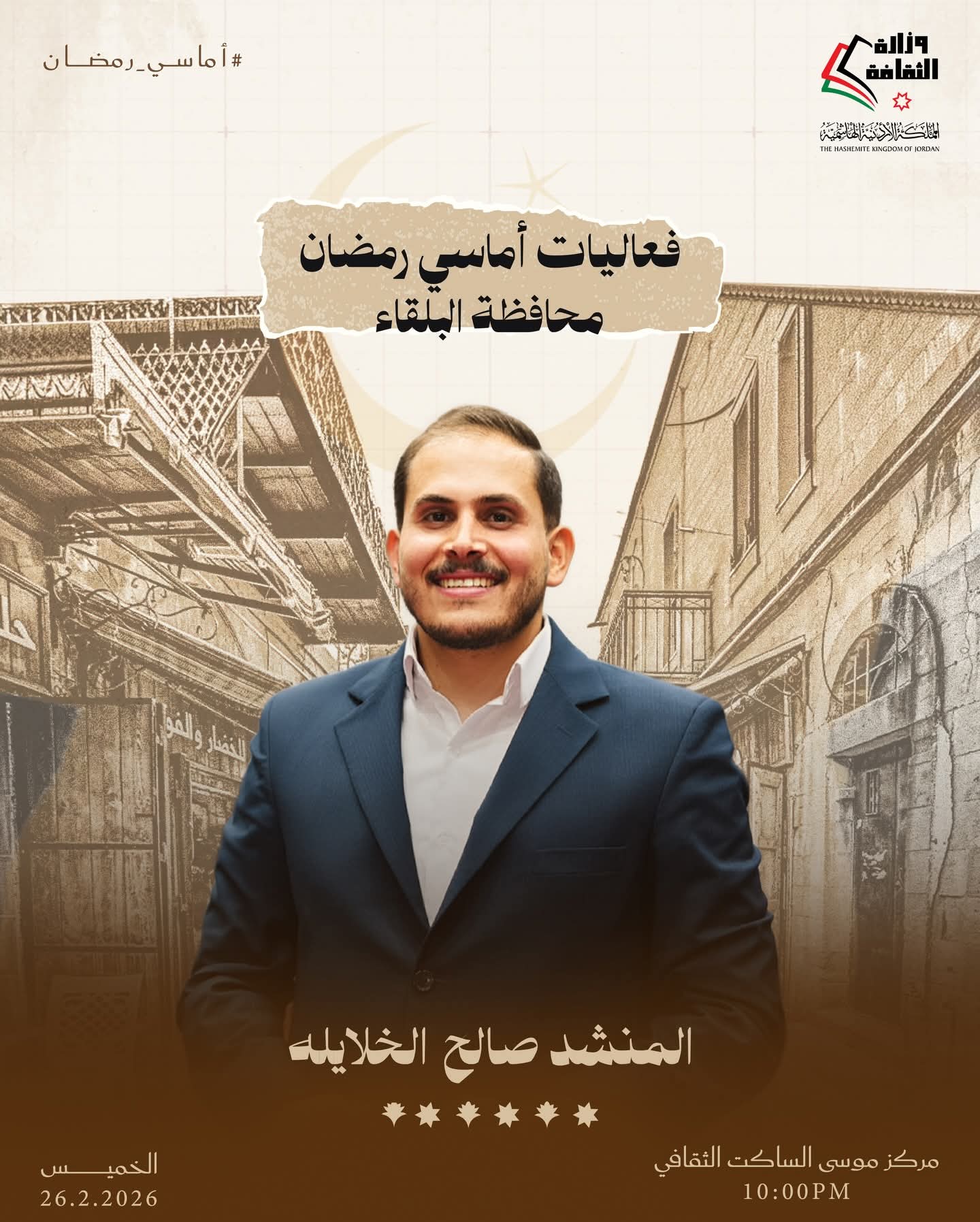 كما تستضيف محافظة الزرقاء عند الساعة العاشرة مساءً، في مركز الملك عبد الله الثاني الثقافي، حفلًا لفرقة «أنوار الهدى» للإنشاد الديني.