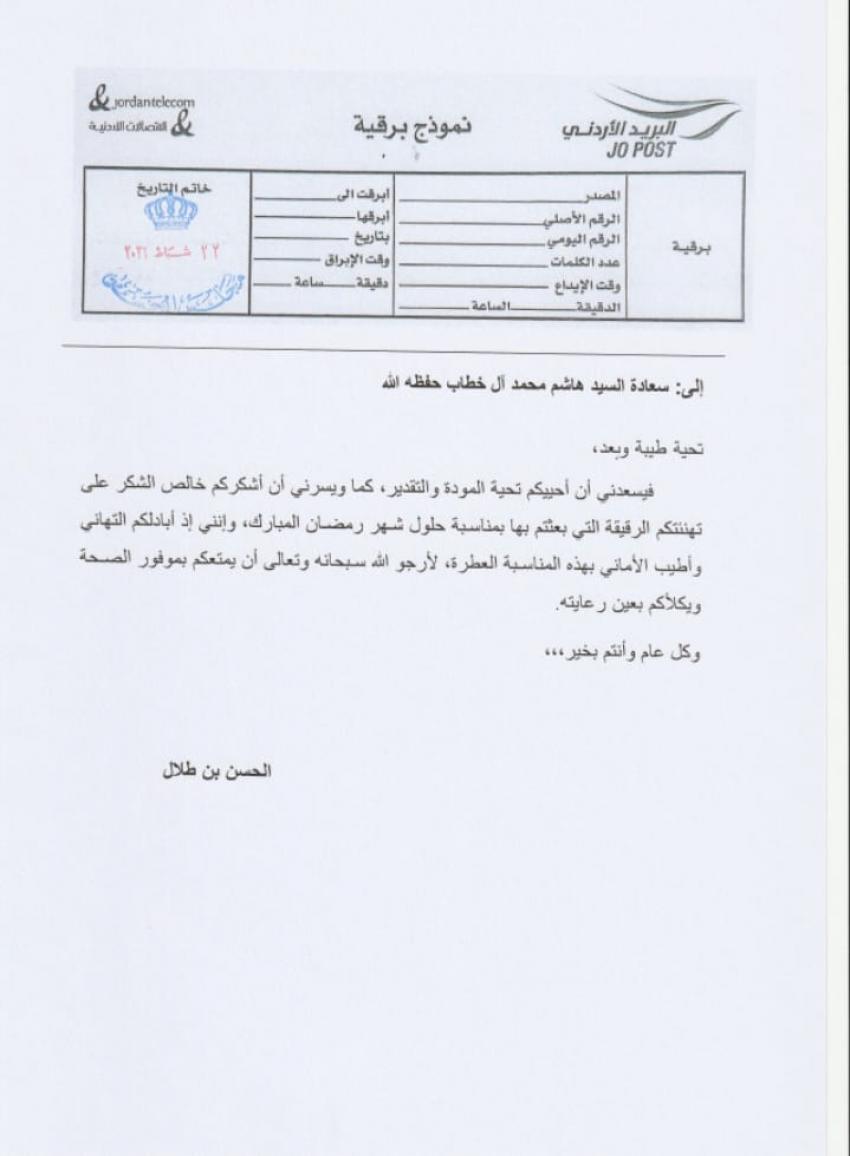 القلعة نيوز- وجه صاحب السمو الملكي الأمير الحسن بن طلال رسالة شكر وتقدير إلى رئيس الهيئة الإدارية لفريق "كلنا خلف قيادتنا الهاشمية" هاشم محمد آل خطاب، وذلك على التهاني الطيبة المقدمة لسموه بمناسبة حلول شهر رمضان المبارك.