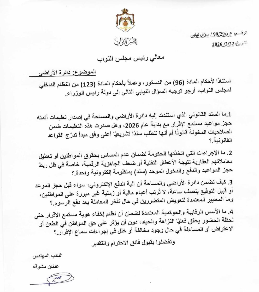 واستند مشوقة في سؤاله إلى أحكام المادة (96) من الدستور، وعملاً بأحكام المادة (123) من النظام الداخلي لمجلس النواب، متسائلًا عن السند القانوني الذي اعتمدته دائرة الأراضي والمساحة في إصدار تعليمات أتمتة حجز المواعيد، وما إذا كانت هذه التعليمات صدرت ضمن الصلاحيات المخولة قانونًا، أم أنها تتطلب سندًا تشريعيًا أعلى وفق مبدأ تدرج القواعد القانونية.