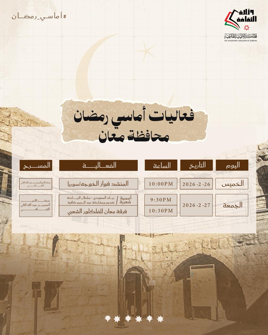 في محافظة معان، تقام في مركز الأمير الحسين الثقافي، يوم الخميس، الساعة العاشرة مساءً، أمسية فنية للمنشد فواز الخواجه من سوريا.
