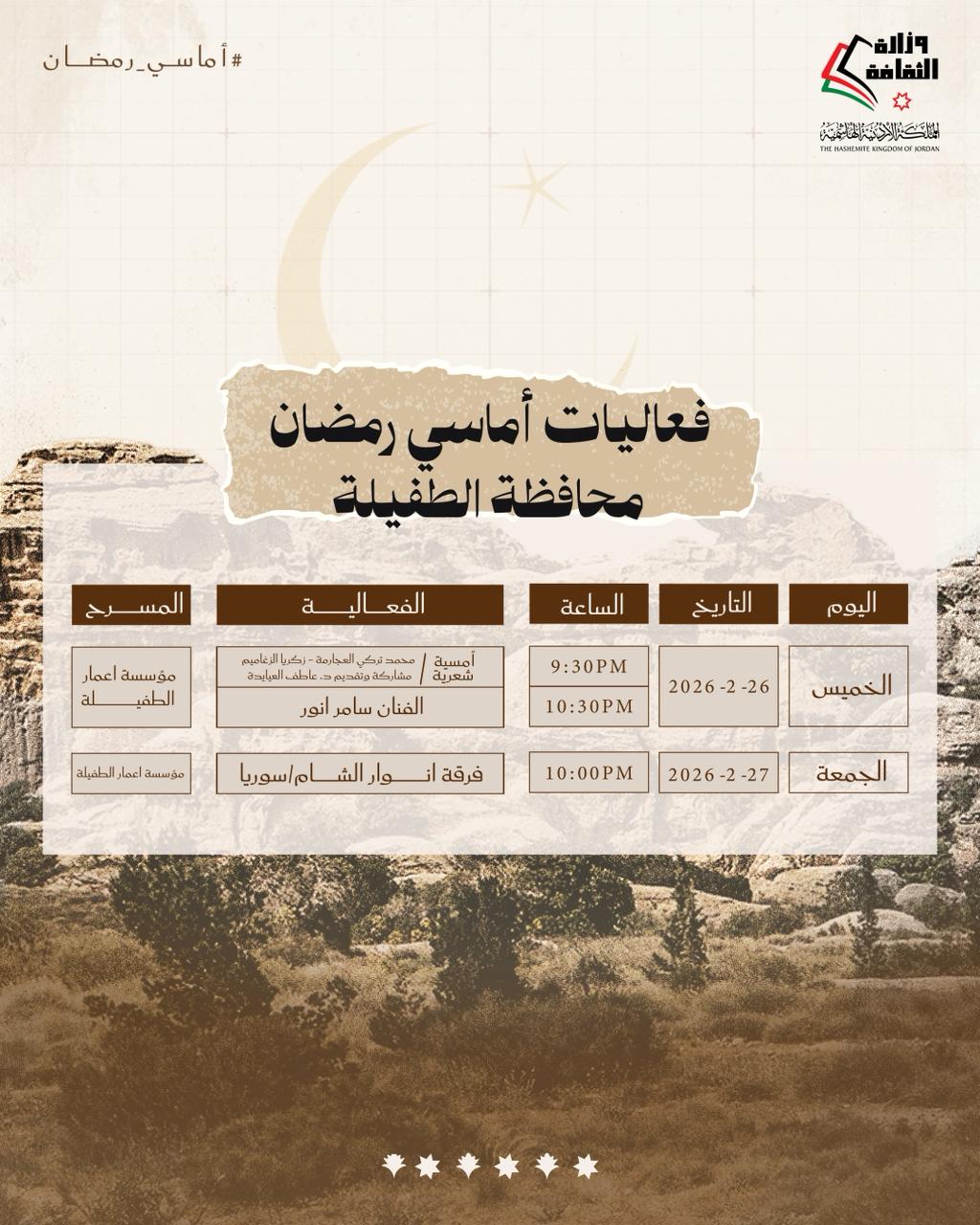 في محافظة الطفيلة، تعقد يوم الخميس، الساعة التاسعة والنصف مساءً، في مؤسسة إعمار الطفيلة، أمسية شعرية بمشاركة: محمد تركي العجارمة، وزكريا الزغاميم، ويقدمها ويشارك فيها د. عاطف العيايدة. ويقدم الفنان سامر أنور أمسية فنية، الساعة العاشرة والنصف مساءً.