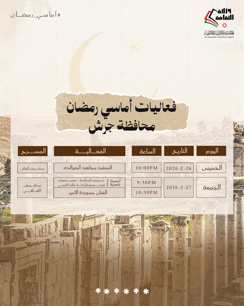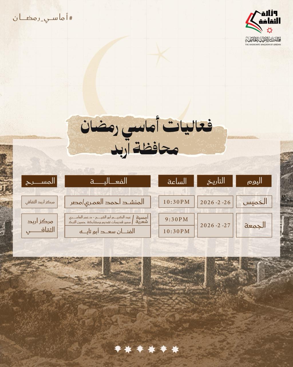 وقال وزير الثقافة مصطفى الرواشدة إن البرنامج يتضمن فعاليات متنوعة تراعي التعدد الثقافي وتعمل على ترسيخ القيم الإيجابية خلال أيام الشهر الفضيل، مشيرًا إلى مشاركة فرق إنشاد ديني ومنشدين أردنيين وعرب.