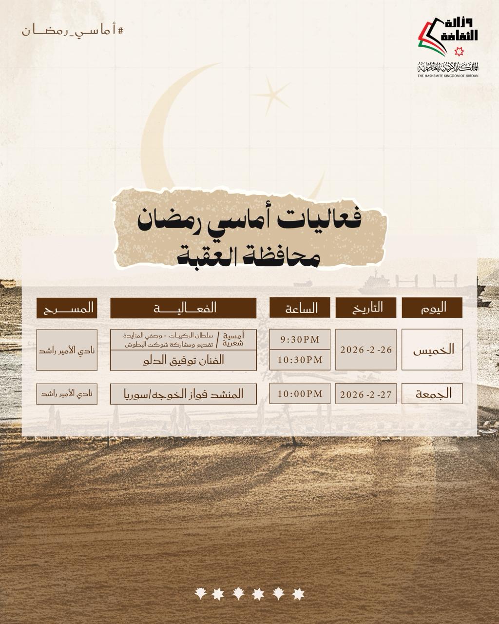 في محافظة العقبة، تقام يوم الخميس أمسية شعرية، عند الساعة التاسعة والنصف مساءً في نادي الأمير راشد، يحييها الشاعران: سلطان الركيبات وصفي المزيدة، ويقدمها ويشارك فيها شوكت البطوش. في حين يقدم الفنان توفيق الدلو أمسية فنية، الساعة العاشرة والنصف مساءً.
