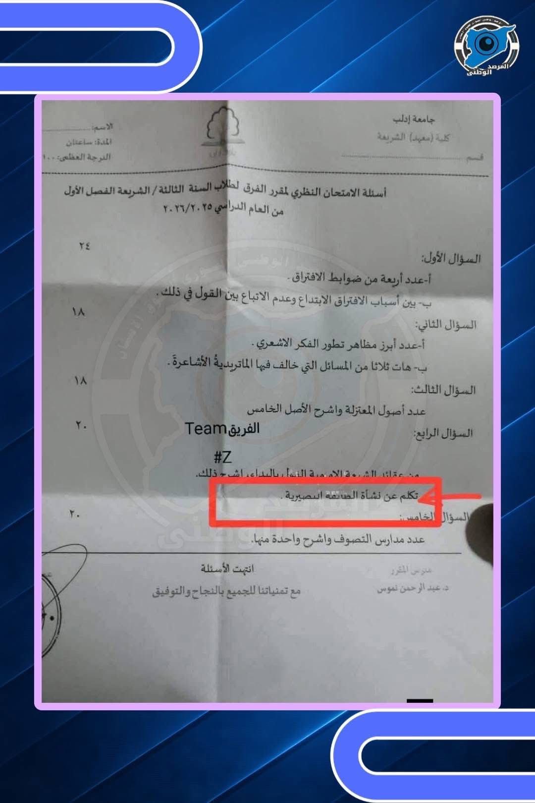 إدراج سؤال في امتحان كلية الشريعة بجامعة إدلب حول "نشأة الطائفة النصيرية” ليس تفصيلاً أكاديمياً عابراً. المسألة لا تتعلق بمعلومة تاريخية، بل بالمصطلح، بالسياق، وبالمنظومة الفكرية التي تحيط به.