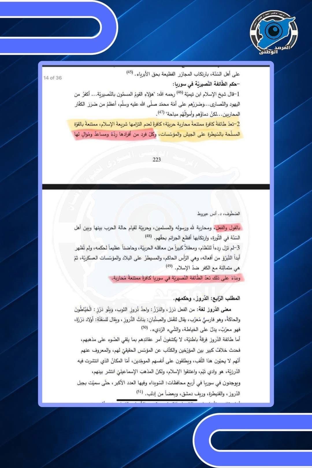 وحين يُضاف إلى ذلك وجود مقال سابق لعميد الكلية وعضو مجلس الإفتاء – وعضو لجنة السلم الأهلي حالياً – يتضمن توصيفاً تكفيرياً صريحاً للطائفة العلوية بوصفها "طائفة كافرة ممتنعة محاربة حربية” مع تعميم الحكم على أفرادها ومن يواليهم، فإننا لا نكون أمام رأي فقهي معزول، بل أمام بنية خطاب متكاملة.