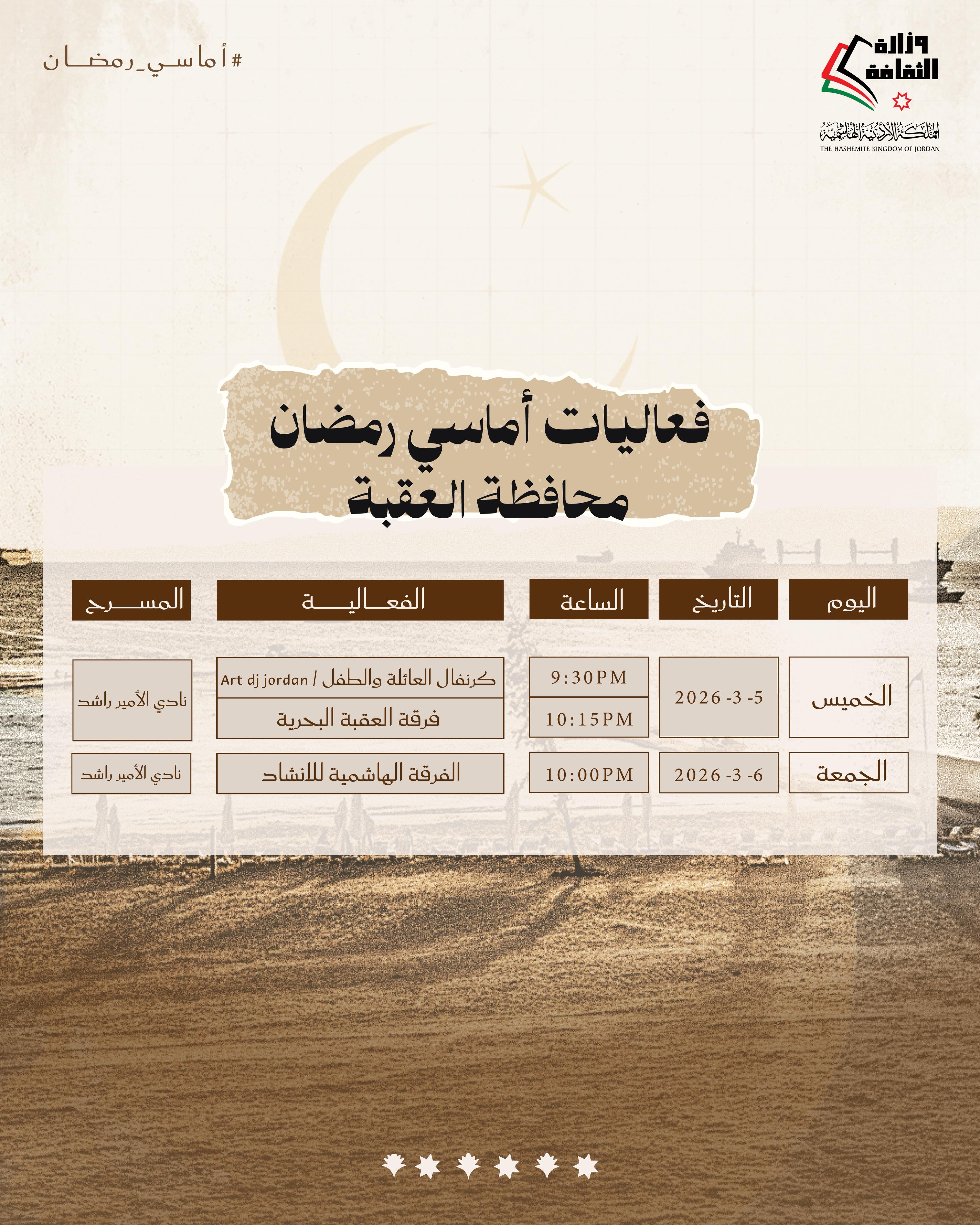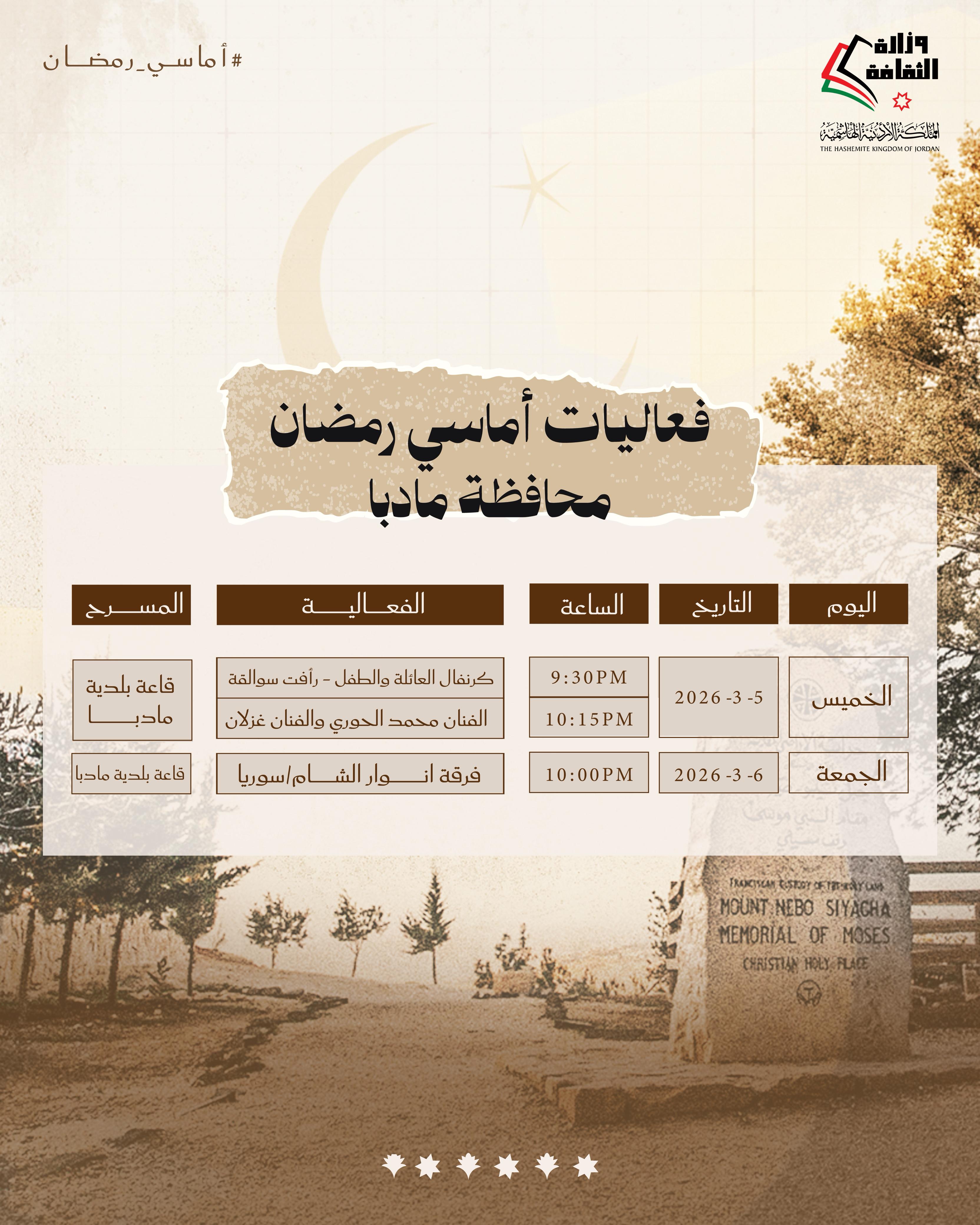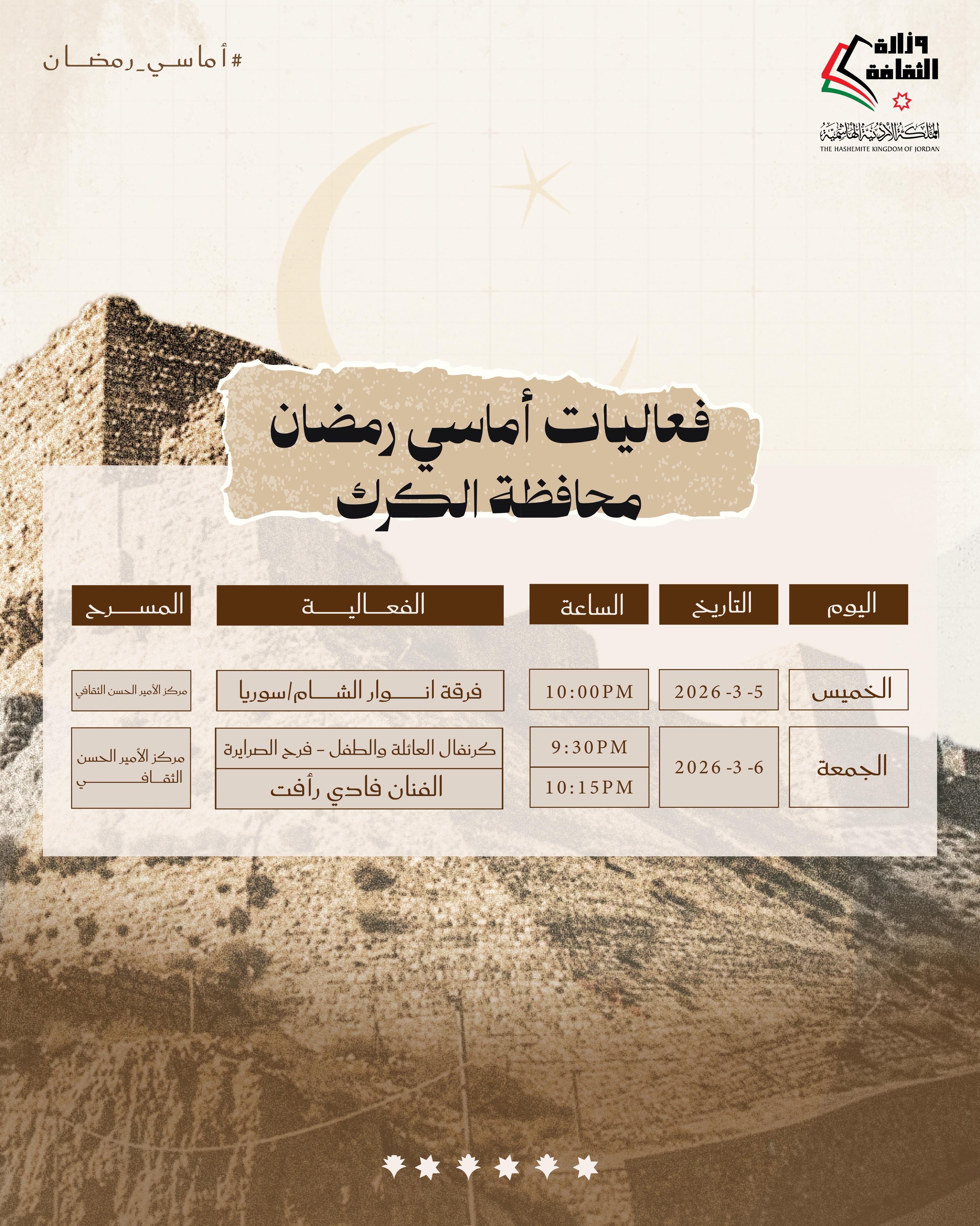 القلعة نيوز- تواصل وزارة الثقافة تنفيذ برنامج «أماسي رمضان» من خلال حزمة فعاليات ثقافية وفنية تقام مساء الخميس والجمعة المقبلين، في عدد من محافظات المملكة، انسجامًا مع ما يحمله الشهر الفضيل من قيم روحية واجتماعية، وذلك في المراكز الثقافية بالمحافظات من الساعة التاسعة والنصف مساءً وحتى الثانية عشرة ليلًا.