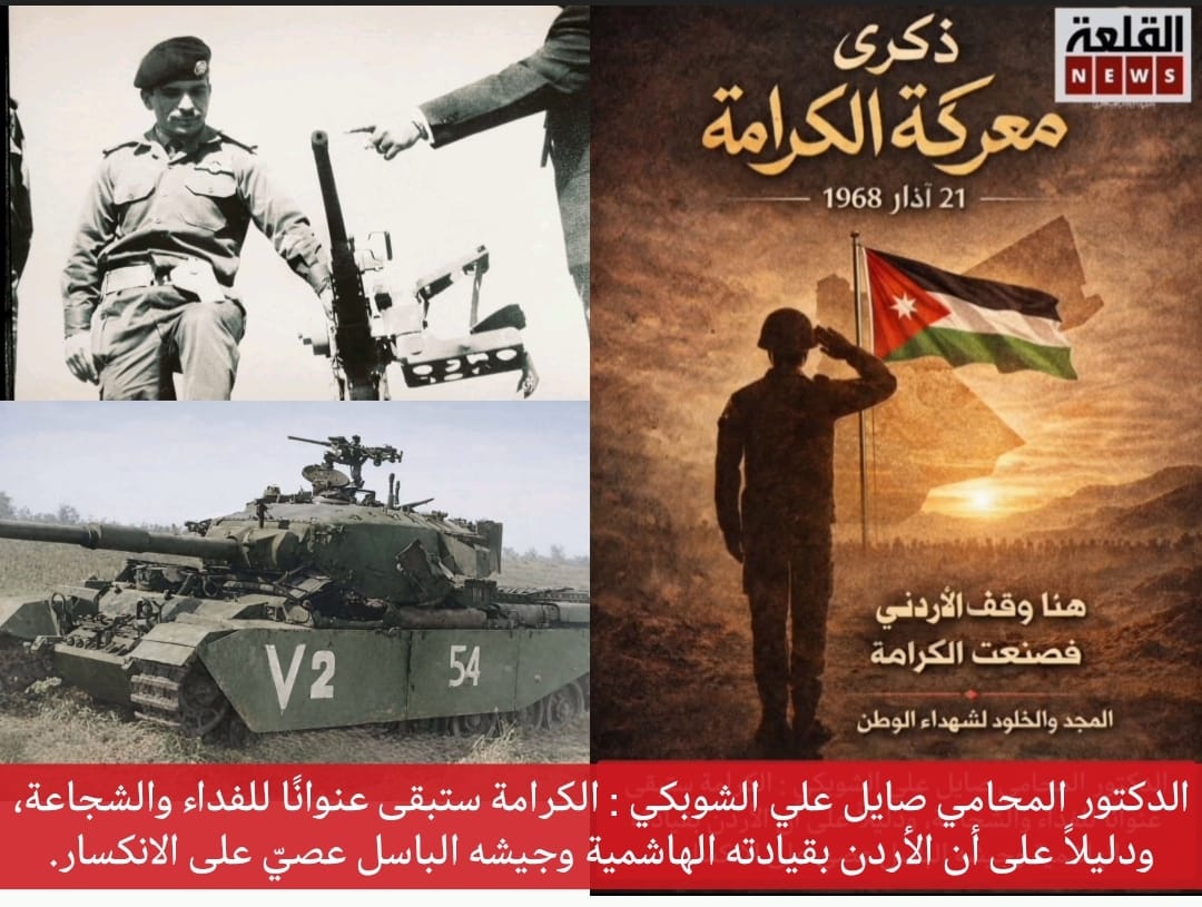 وقال الشوبكي إن ذكرى معركة الكرامة الخالدة ستبقى محطة وطنية مشرقة في تاريخ الأردن، وصفحة مضيئة سطّر فيها الجيش العربي الأردني أروع معاني البطولة والفداء، حين واجه العدو بشجاعة وإيمان وثبات، ودافع عن ثرى الوطن والأمة، ليسجل نصرًا تاريخيًا أعاد للأمة العربية ثقتها بنفسها، ورسّخ هيبة الأردن ومكانته.