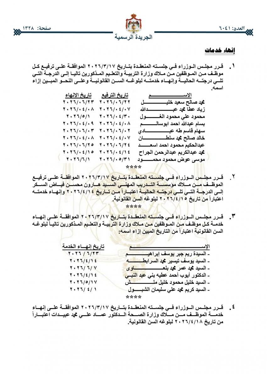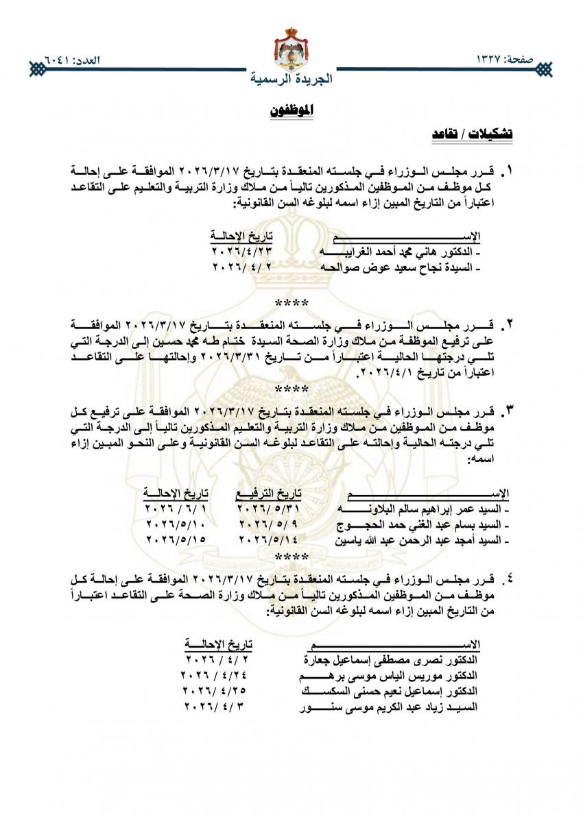 القلعة نيوز - صدر في عدد الجريدة الرسمية اليوم الخميس، قرارات مجلس الوزراء باحالة عدد من موظفي الحكومة إلى التقاعد.