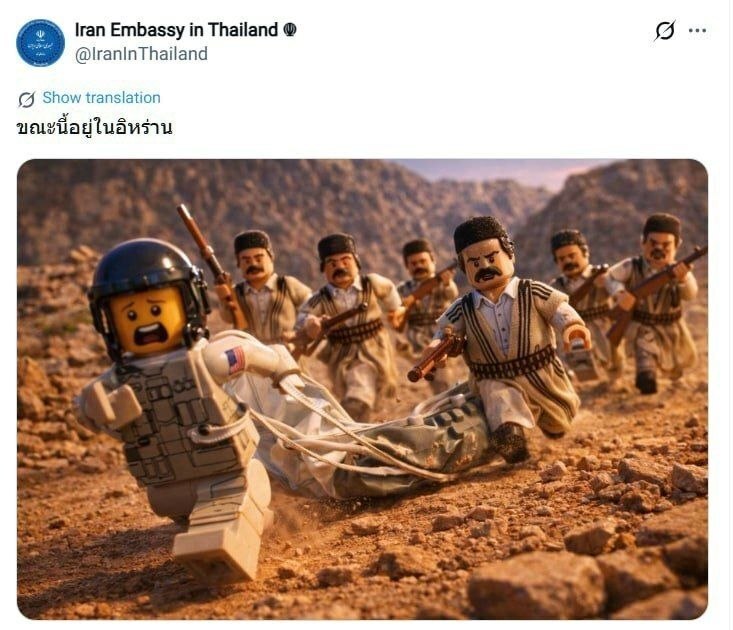 وعلقت سفارة إيران في تايلاند على خبر إسقاط المقاتلة الأمريكية والمصير المجهول للطيار بصورةساخرة، ونشرتها على منصة "إكس".