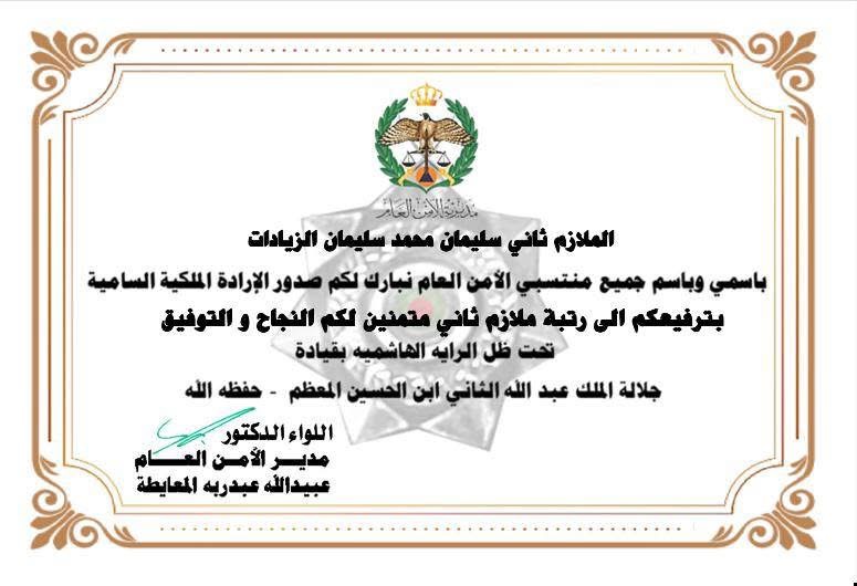 يتقدم محمد سلامه الزيادات الكعابنه وعائلته باسمى ايات التهاني والتبريكات الى الاخت العزيزه ام فيصل وعائلتها بمناسبة ترفيع أبنها الملازم سليمان محمد الزيادات الكعابنه / أبو مشعل ، سائلين المولى عز وجل ان يبارك له هذا الترفيع ويبارك لكم فيه وعقبال أعلى المراتب والدرجات ان شاء الله والف الف مبروك .